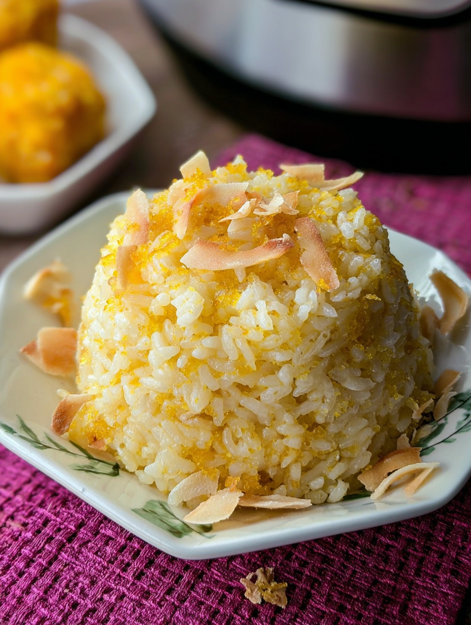 Nach dem Einweichen wird der Reis gedämpft. Traditionell nutzt man dafür Bambusdämpfer, aber ein herkömmlicher Topf mit einem Dämpfeinsatz funktioniert genauso gut. Das Dämpfen dauert etwa 30 bis 45 Minuten, je nachdem, wie lange Sie den Reis eingeweicht haben. Der Reis ist fertig, wenn er transparent und zart ist, aber immer noch seinen charakteristischen Biss behält. Während der Reis dämpft, ist dies die perfekte Gelegenheit, die Kokossauce vorzubereiten, denn wir brauchen den Reis heiß, um sie optimal aufnehmen zu können.