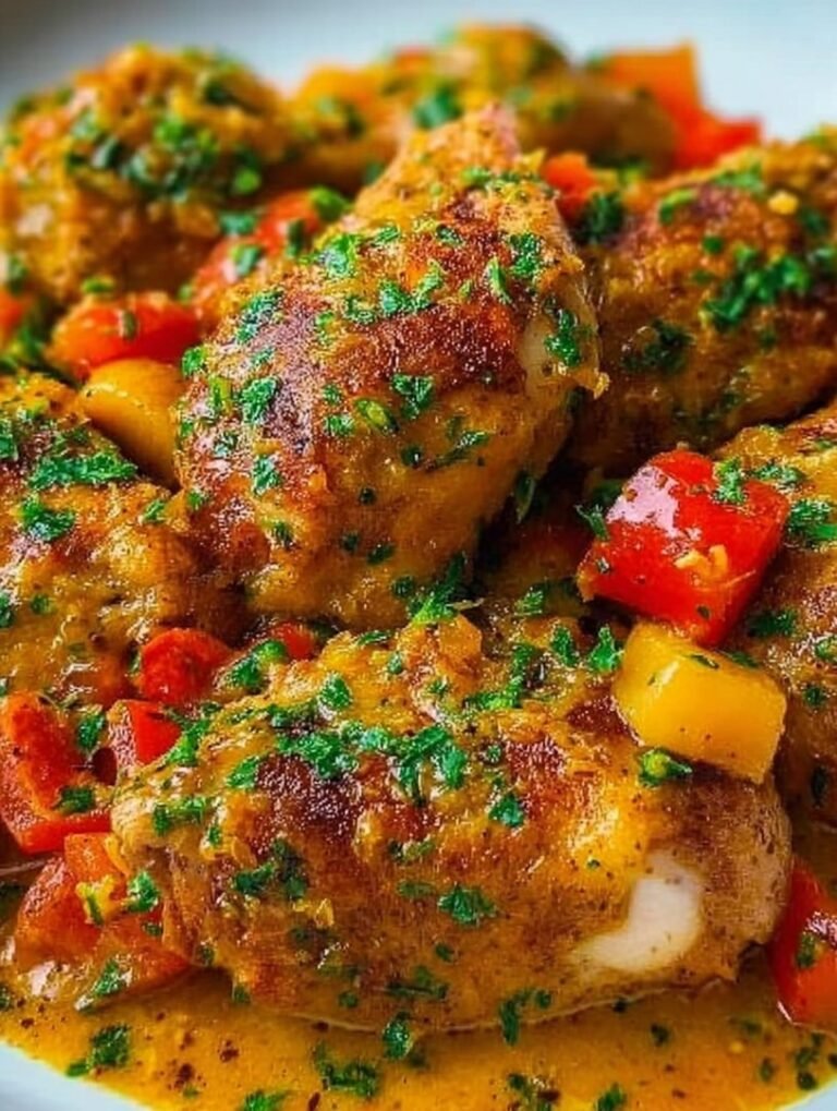 Mit seiner leuchtend goldgelben Soße und dem perfekt gebräunten Hähnchen ist dieses Gericht ein echter Hingucker auf jedem Tisch, der Urlaubsstimmung verbreitet.