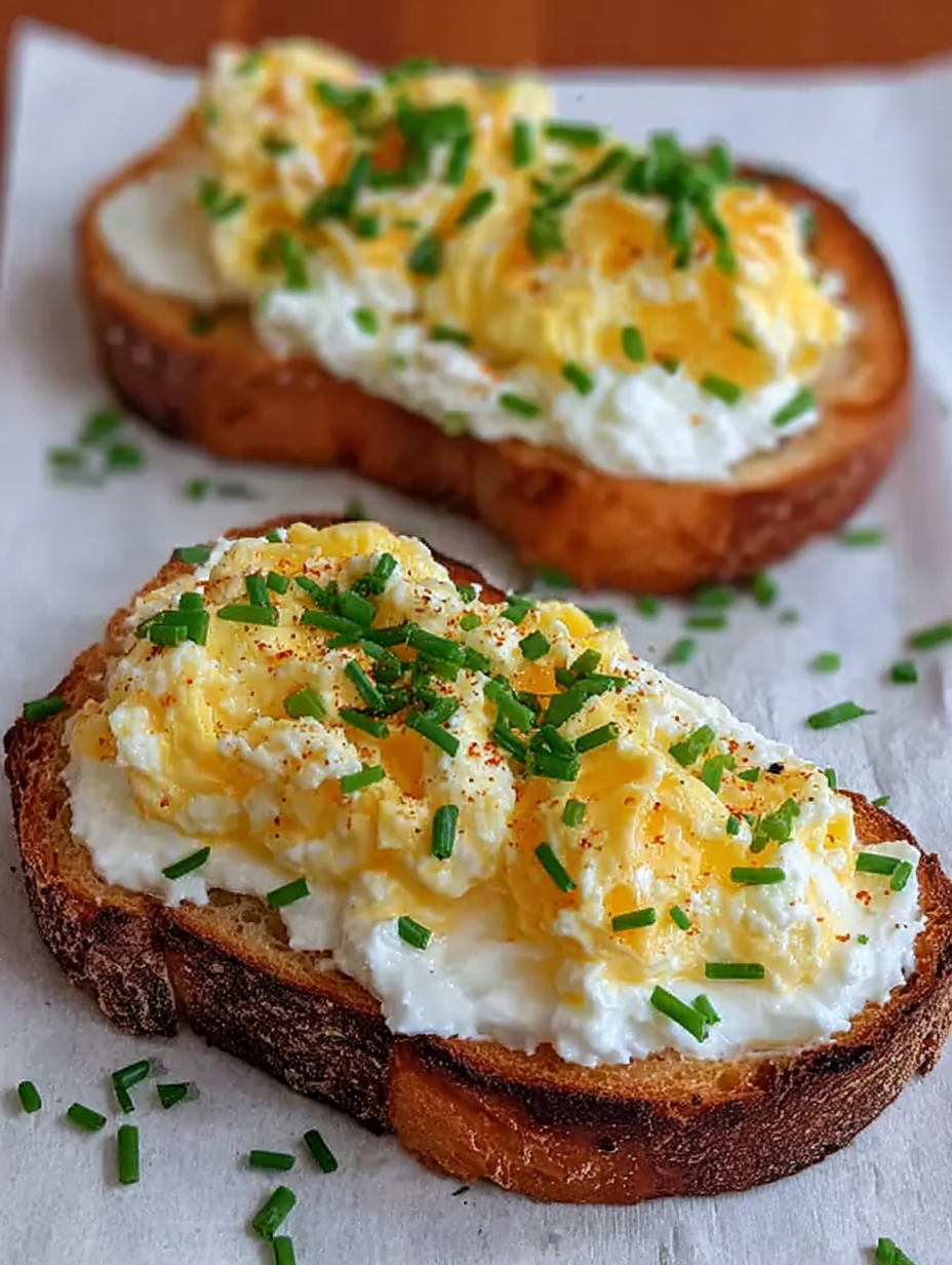 Eleganter Brunch-Genuss: Luftiger Ricotta, verfeinert mit Schnittlauch und einem Ei, auf krossem Toast. In wenigen Schritten zubereitet. Ein cremig-würziger Traum.