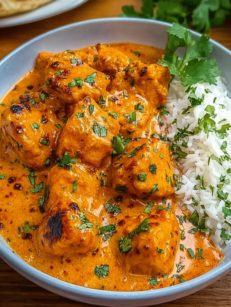 Servieren Sie Das Butter Chicken sofort, garniert mit frischem Koriander und einem Schuss zusätzlicher Sahne. Es schmeckt am besten, wenn es mit duftendem Basmatireis und warmem Naan-Brot, das sich perfekt zum Aufsaugen der cremigen Soße eignet, genossen wird.
