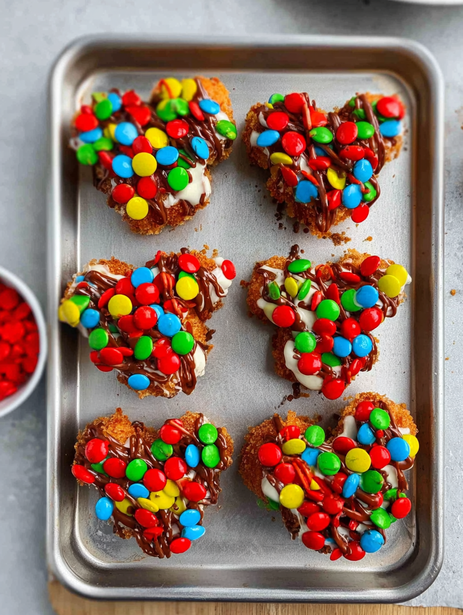2. Backen und Kühlen:Setzen Sie mit einem großen Eiskugellöffel (ca. 7-8 cm Durchmesser) Teigportionen auf ein mit Backpapier ausgelegtes Blech. Drücken Sie die Teigkugeln leicht flach. Backen Sie sie für 12 bis 14 Minuten, bis die Ränder leicht gebräunt sind. Sie sollten sich weich anfühlen, fast wie kleine Küchlein. Lassen Sie die Kekse 5 Minuten auf dem Blech und dann vollständig auf einem Gitter abkühlen. Dieser Schritt ist entscheidend für das Gelingen dieserDisneyland-Nachahmungsrezepte.