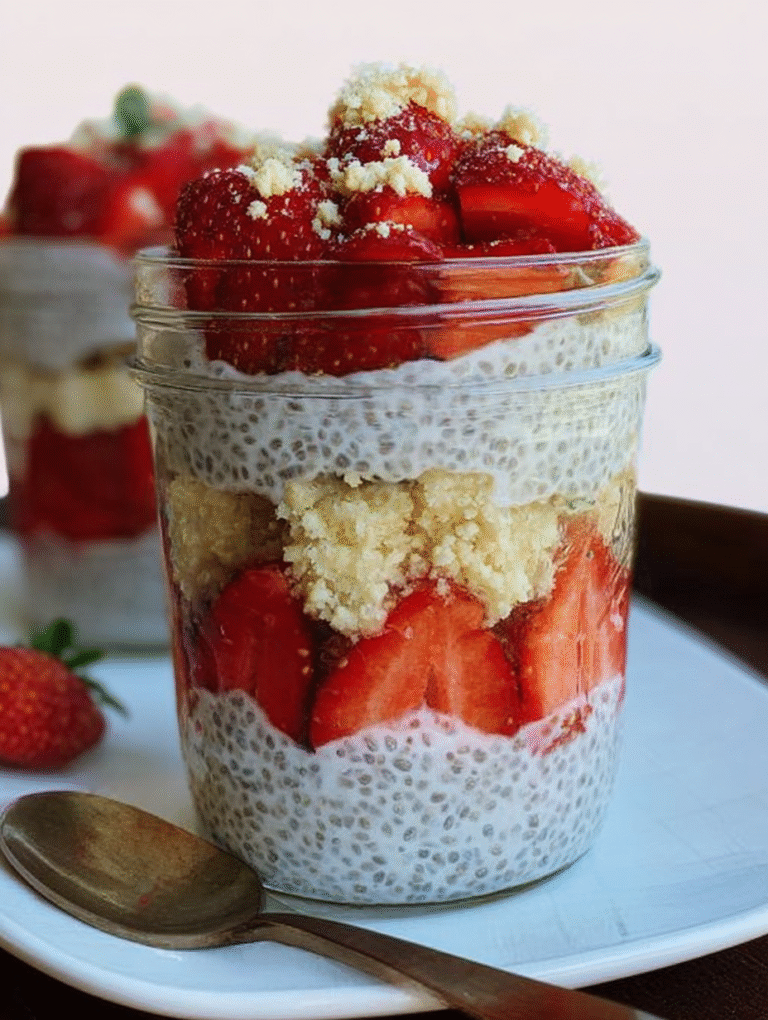 Absolut! Dieser Erdbeer-Shortcake-Chia-Pudding ist von Natur aus glutenfrei, da Chiasamen, Erdbeeren und pflanzliche Milch keine glutenhaltigen Inhaltsstoffe enthalten. Um ihn vollständig vegan zu machen, ersetzen Sie den griechischen Joghurt einfach durch einen cremigen, ungesüßten Kokos- oder Sojajoghurt. Sollten Sie sich entscheiden, für den authentischen “Shortcake”-Effekt Kekskrümel hinzuzufügen, stellen Sie sicher, dass Sie zertifizierte glutenfreie Kekse oder ein glutenfreies Müsli verwenden. Dies macht das Dessert zu einer ausgezeichneten und sicheren Wahl für alle, die empfindlich auf Gluten reagieren oder sich rein pflanzlich ernähren möchten, ohne auf den wunderbaren Shortcake-Geschmack verzichten zu müssen.