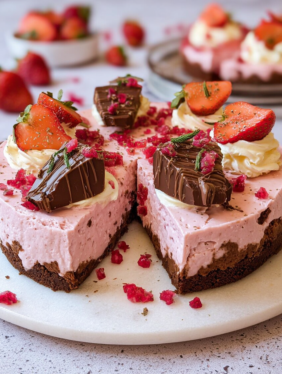- Der Kuchen sieht dank der leuchtend roten Erdbeeren auf der dunklen Schokoladenbasis einfach spektakulär und extrem fotogen aus.