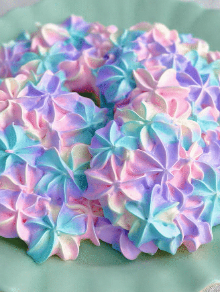Ich brauchte dringend ein Dessert, das nicht nur gut schmeckte, sondern auch meine fehlgeschlagene Gartenarbeit kaschierte. Als ich meine letzten Eiweiße und die neuen Lebensmittelfarben sah, blitzte die Idee auf: Warum nicht die Luftigkeit eines Baisers mit der Pracht meiner ertrunkenen Hortensien verbinden? So entstanden diese wunderschönenge Hortensien-Baiser-Kekse.