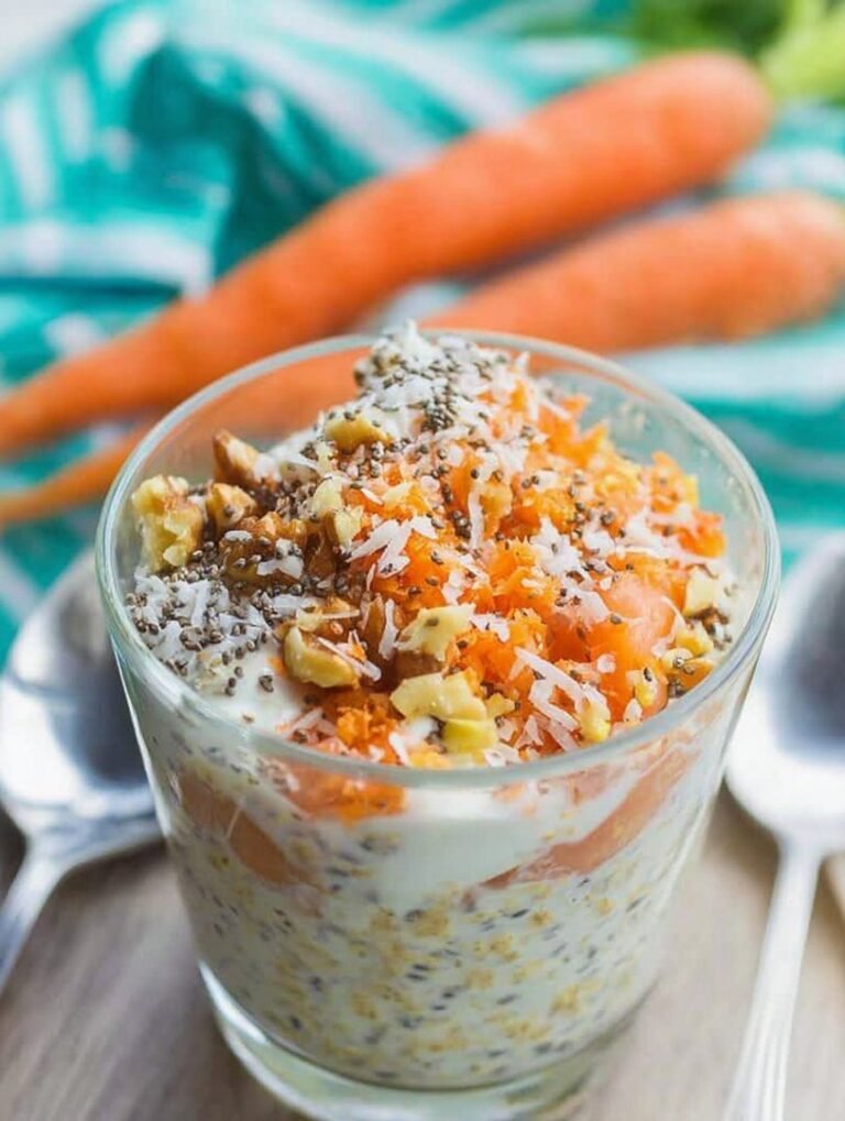 - Das königliche Topping:Vor dem Servieren die Walnüsse oder Pekannüsse darüber streuen, um einen Crunch-Effekt zu erzielen. Für das klassische „Frischkäse-Frosting-Gefühl“ verrühren Sie einen pflanzlichen Frischkäse-Ersatz mit etwas Ahornsirup und einem Spritzer Zitronensaft. Ein Klecks davon auf den Karottenkuchen-Overnight-Oats macht den Genuss perfekt.