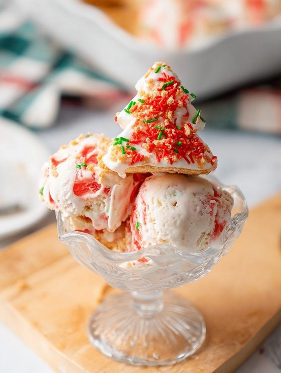- Optisch ist die Eiscreme durch grüne Streusel und rote Zuckerguss-Swirls ein echter Blickfang auf jedem Festtisch.
