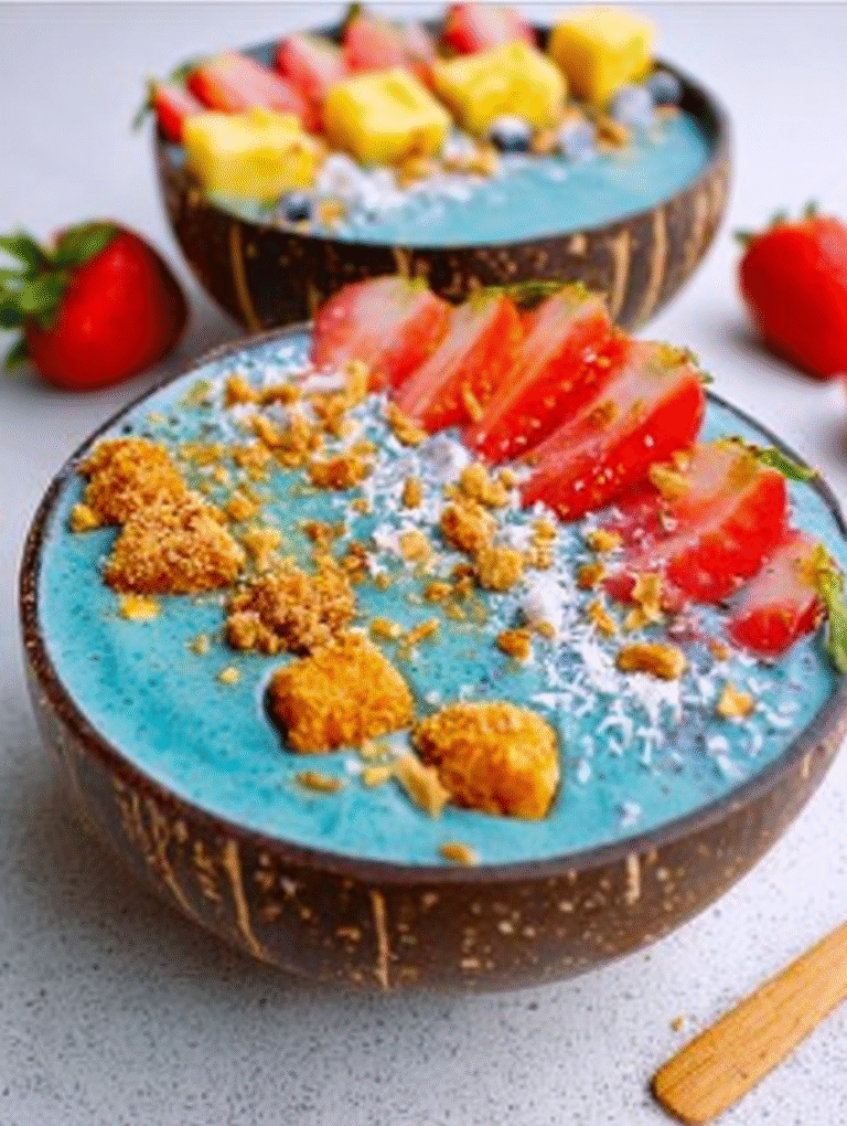 Essen beginnt mit den Augen. Und wenn wir von derMeerjungfrauen-Smoothie-Bowlsprechen, sprechen wir von einer Farbe, die sofort gute Laune verbreitet. Der tiefe, schimmernde Blauton erinnert an einen klaren Sommertag am Ozean. Diesen Effekt erzielen wir durch die Verwendung von Blue Majik Spirulina oder Drachenfruchtpulver, die beide natürliche Pigmente ohne jeglichen Eigengeschmack liefern. Psychologisch gesehen wirkt Blau beruhigend, aber in Kombination mit dem leuchtenden Gelb von Mango und Banane wird es zu einem energetisierenden Erlebnis.