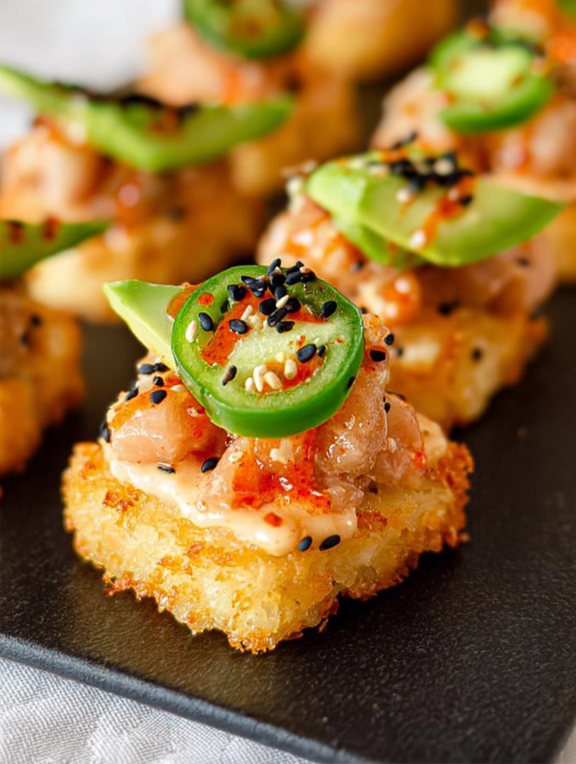 - Diese Häppchen bieten ein aufregendes Texturerlebnis, das von außen super knusprig ist und innen eine cremige, würzige Thunfisch-Creme verbirgt.