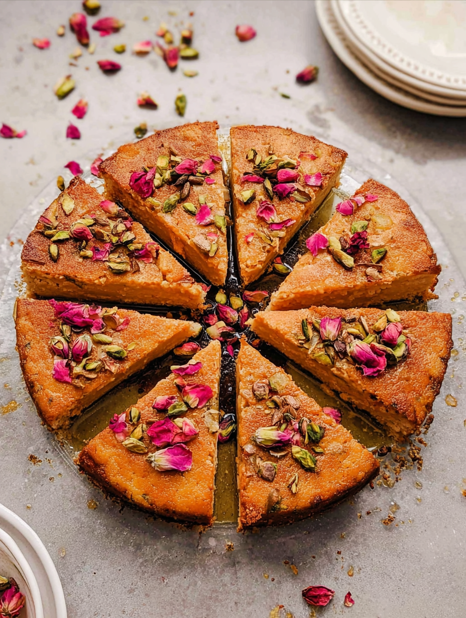 6. Step 6: Den Persischen Liebeskuchen vollständig abkühlen lassen. Vor dem Servieren traditionell mit Puderzucker bestreuen und optional mit gehackten Pistazien und getrockneten Rosenblättern garnieren.