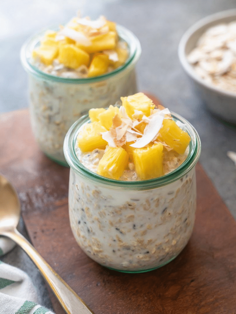 Karibik-Traum zum Löffeln! Diese Pina Colada Overnight Oats bieten cremige Kokosmilch und süße Ananas. Nur mischen, kühlen und genießen.