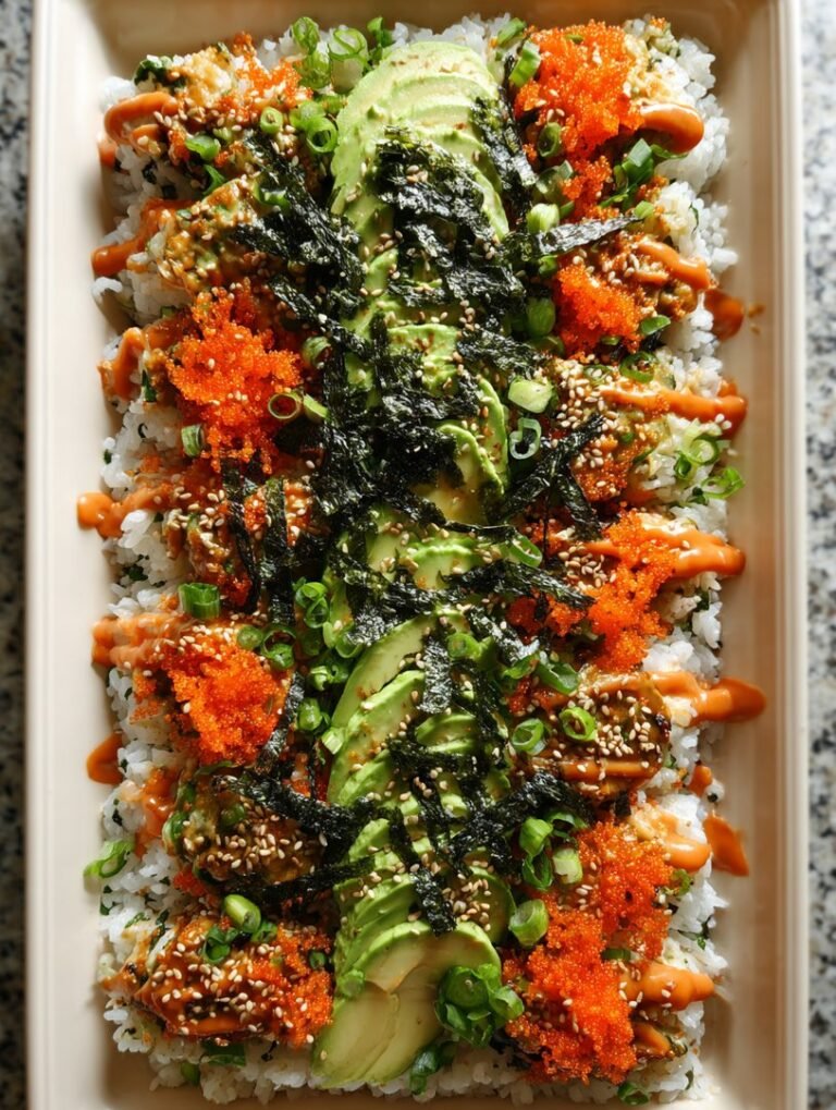 Der Sushi-Auflauf vereint cremige Schärfe und klassischen Reisgeschmack, ganz ohne Rollen! Nori-Basis, perfekt gewürzter Reis und ein würziger Mayo-Kick. Anleitung & Nährwerte sind dabei.